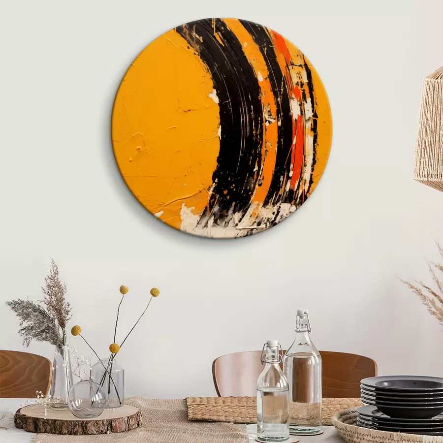 Abstrakčios juodos juostelės ant geltono aliejaus paveikslo
