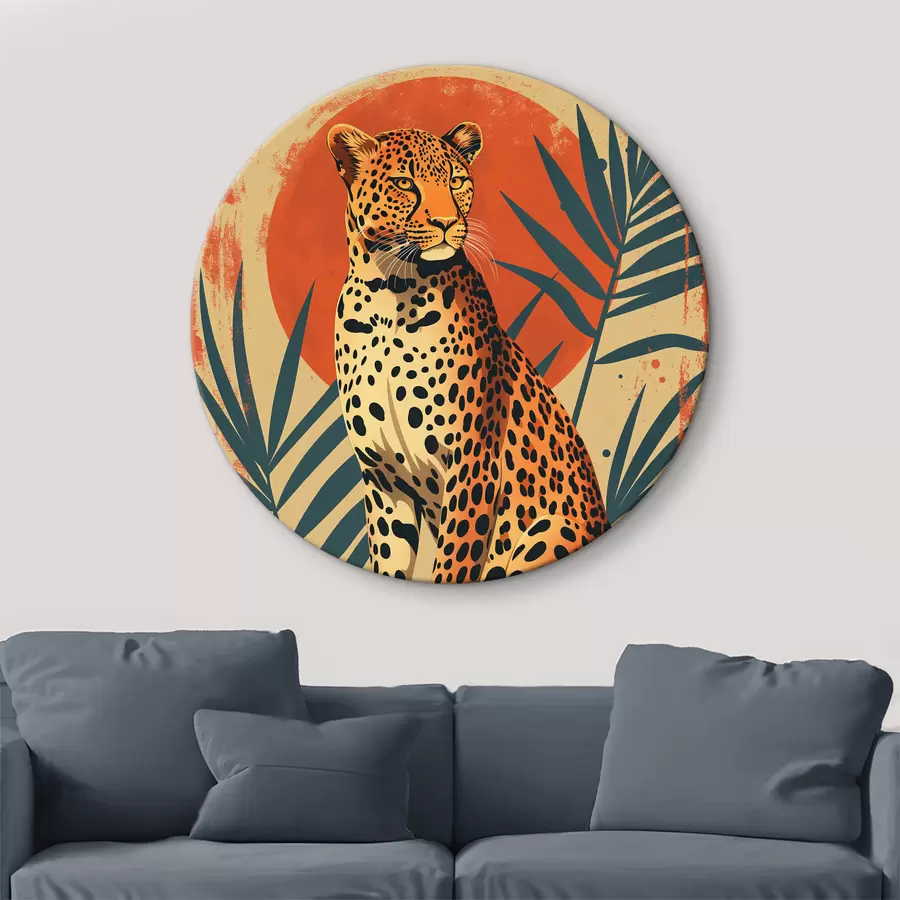 Leopardo žvilgsnis: drąsi kompozicija su vasariškais palmių lapais ryškiai raudoname fone