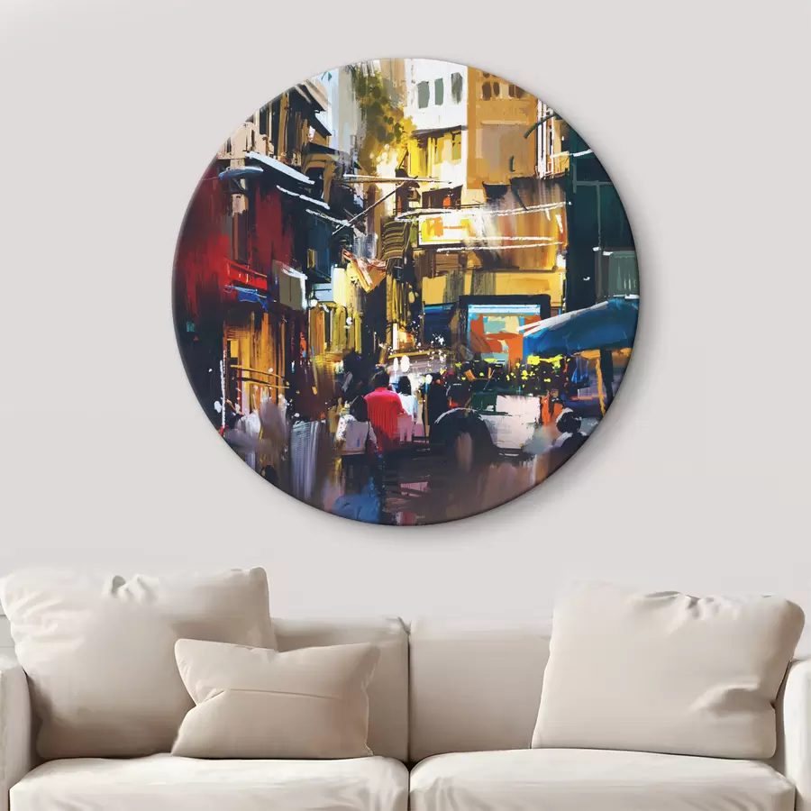 Judrus akvarelės meno gatvės vaizdas Europos mieste, kuriame žmonės vaikšto ir važiuoja dviračiais