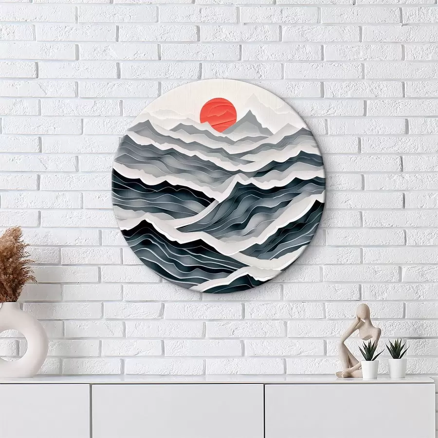 Saulėlydis kalnuose, upė, gamtos peizažai, akriliniai dažai