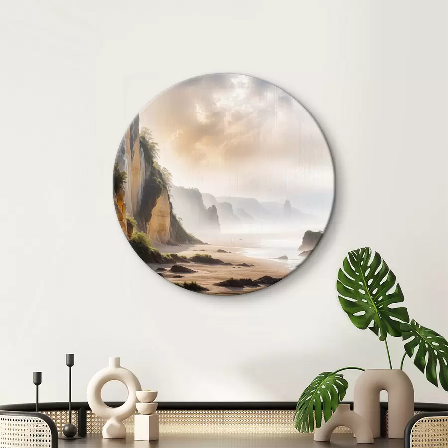 Peizažas su aukštomis uolėtomis uolomis, apgaubtomis rūko nuo prasiskverbiančios saulės šviesos