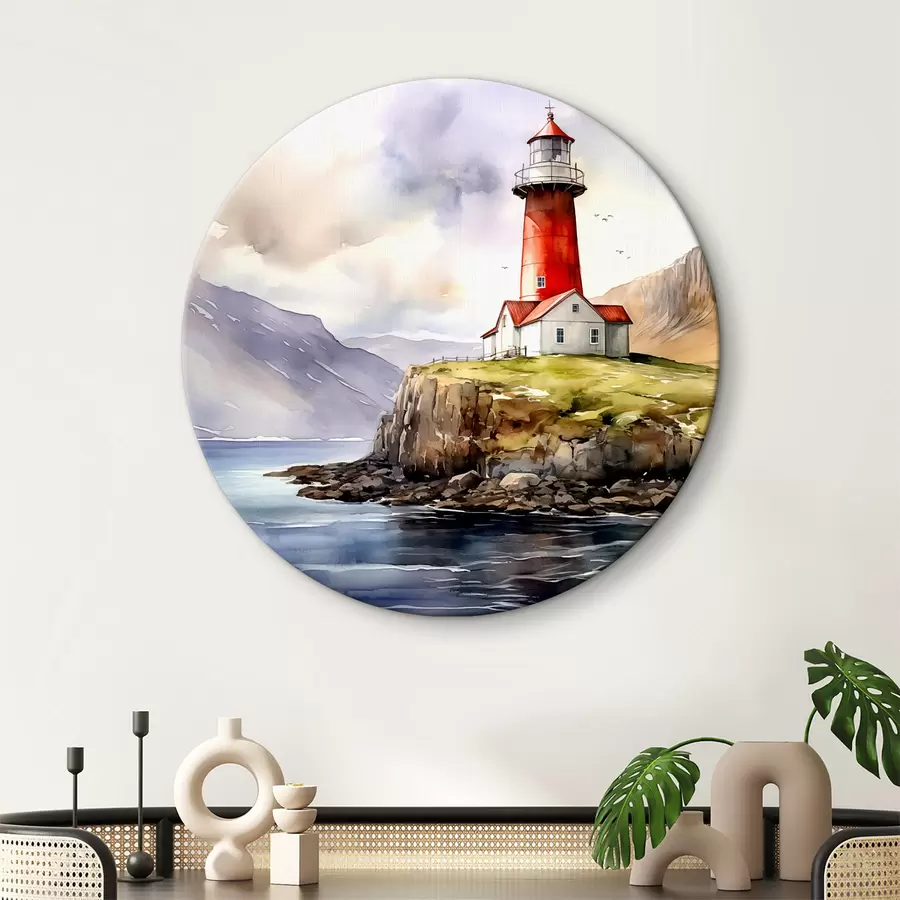 Raudonas švyturys ant šlaito netoli įlankos saloje kalnų ir debesuoto dangaus fone