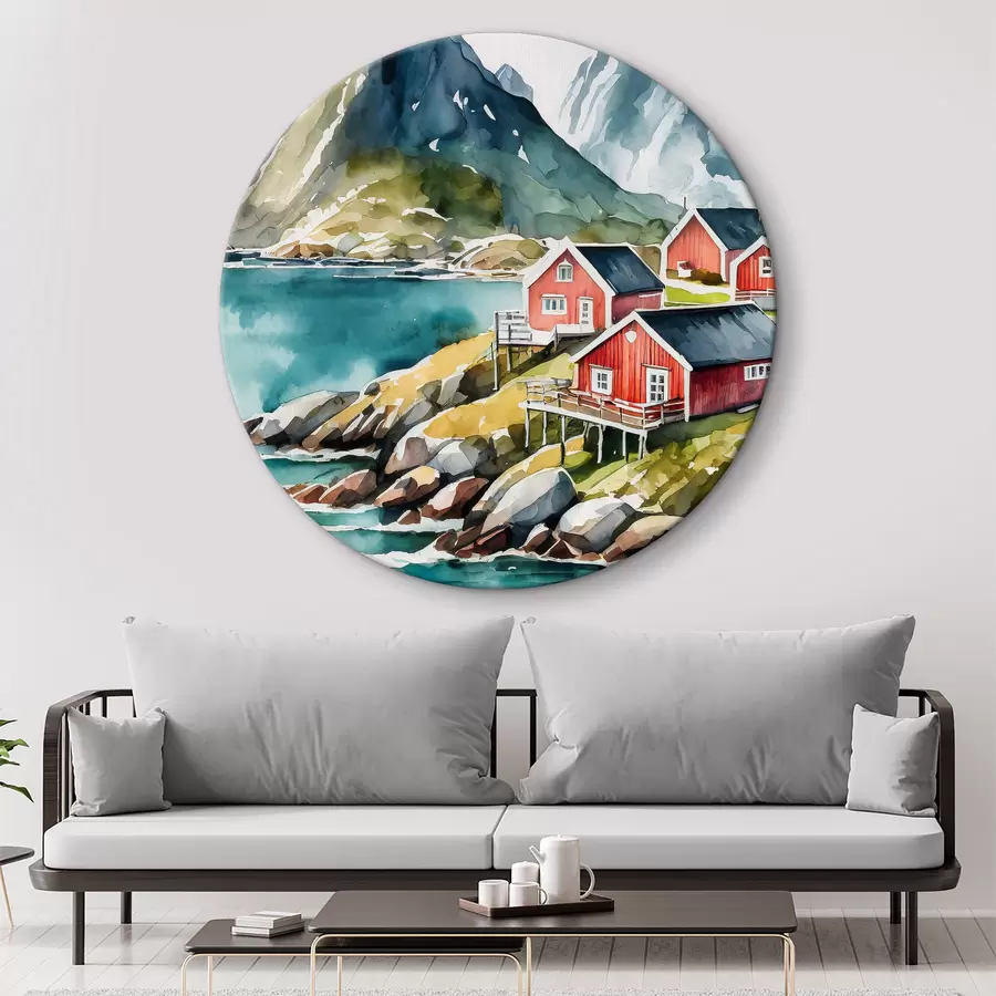 Lofoteno vasaros peizažas,šiaurės jūra,jachta,kalnai,namas,gamta,akrilo menas