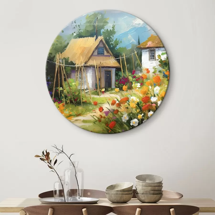 Vasaros sodas su gėlėmis, sodyba, mėlynas dangus, aliejinių dažų teptuko potėpiai
