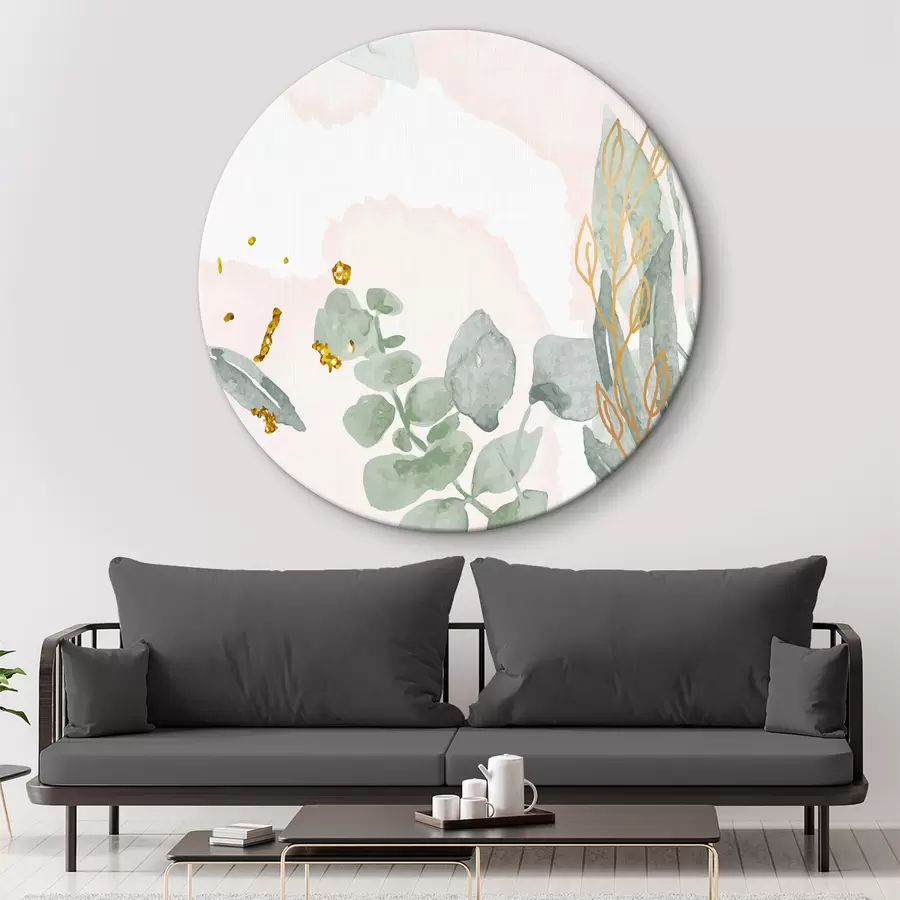 Eukaliptų šakų kompozicija subtiliame akvarelės fone