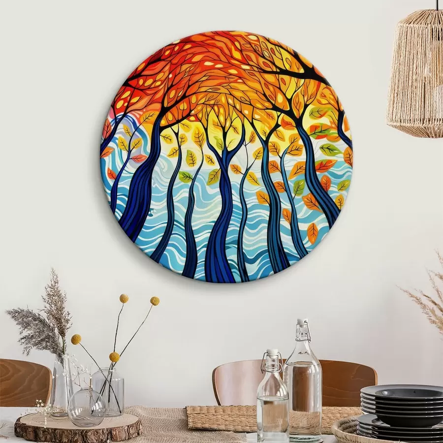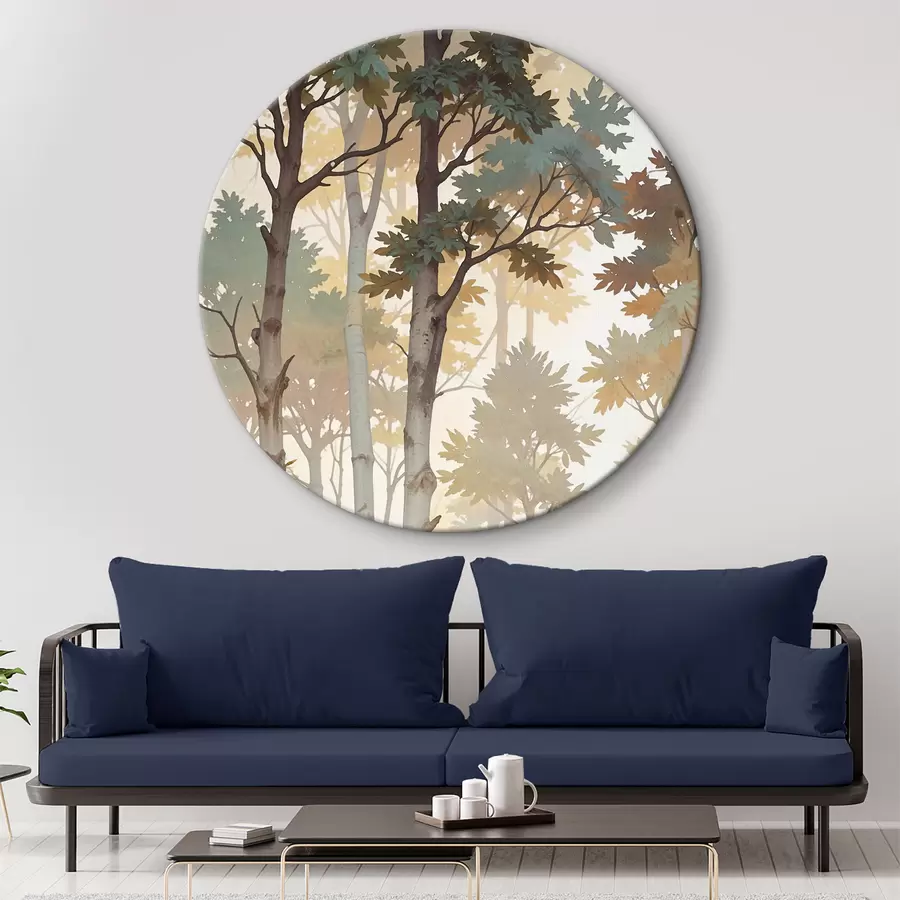 Miško kraštovaizdis su aukštais medžiais geltonos, oranžinės ir žalios spalvos atspalviais, miglotas ir nuotaikingas