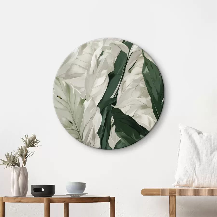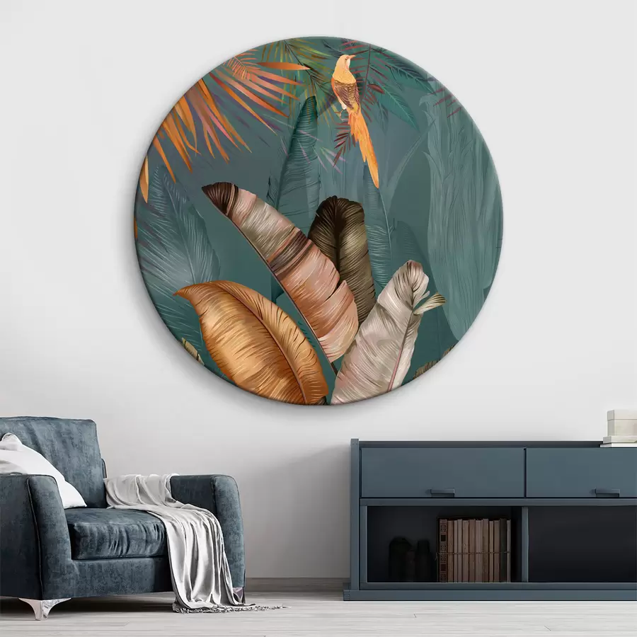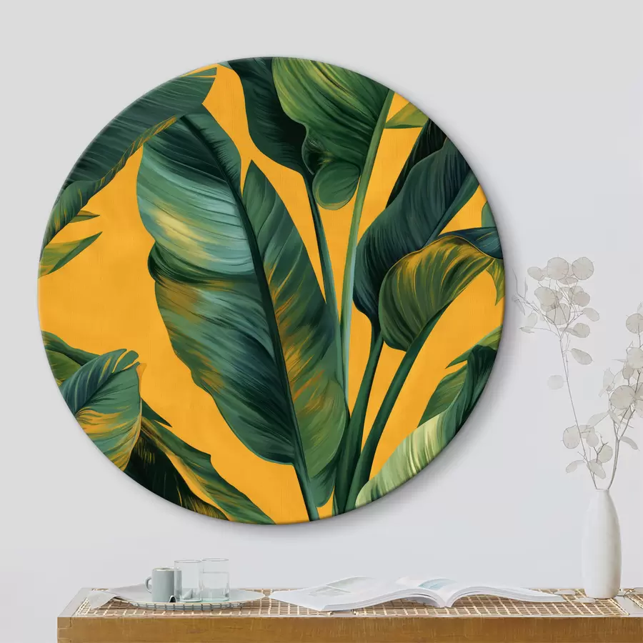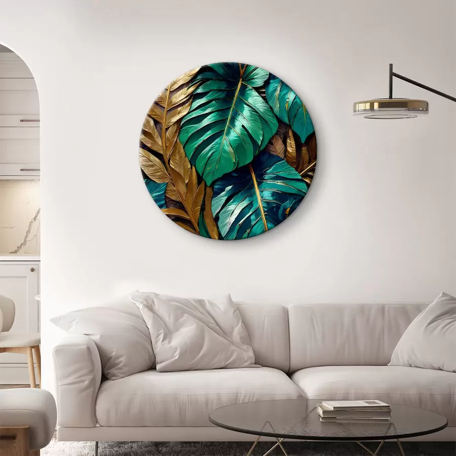 Akrilu tapytas gyvybingų žalių ir žydrų atspalvių atogrąžų lapų paveikslas