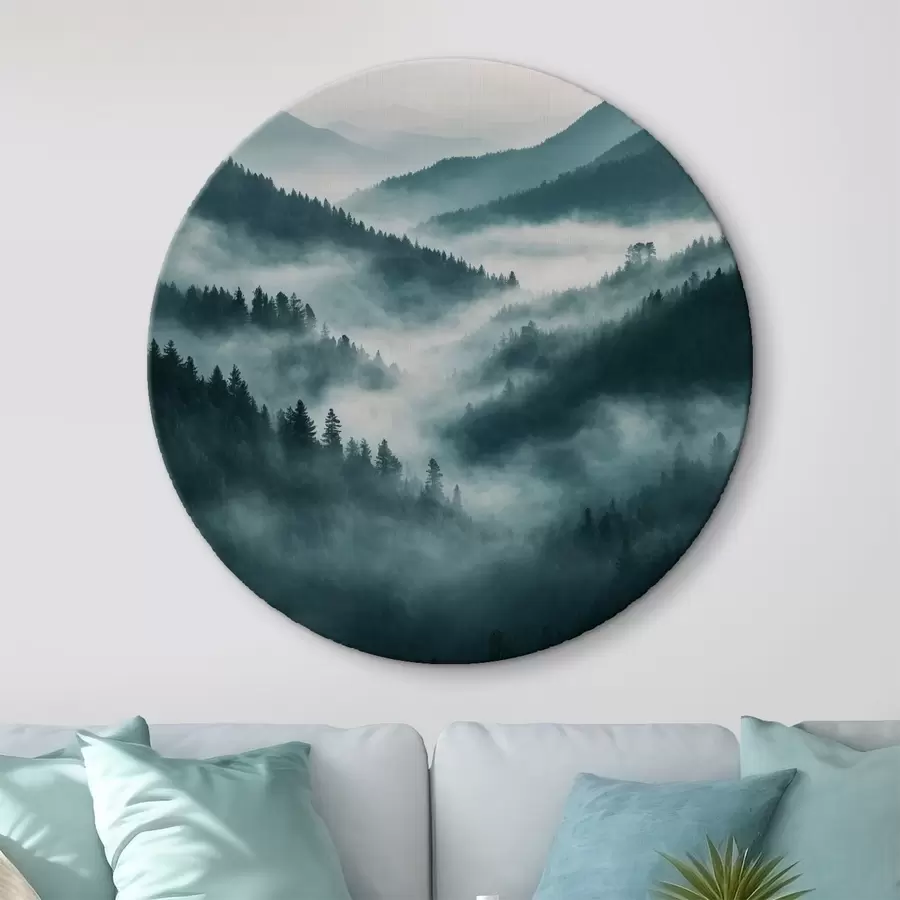 Kalnų kraštovaizdis su mišku ir danguje skrendančiais paukščiais, visa tai dengia storas rūko sluoksnis saulėtekio metu
