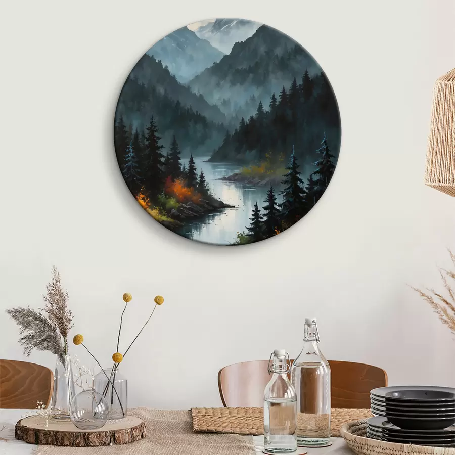 Miglotas ežero kraštovaizdis su pušimis ir kalnais, debesuotas pilkas dangus