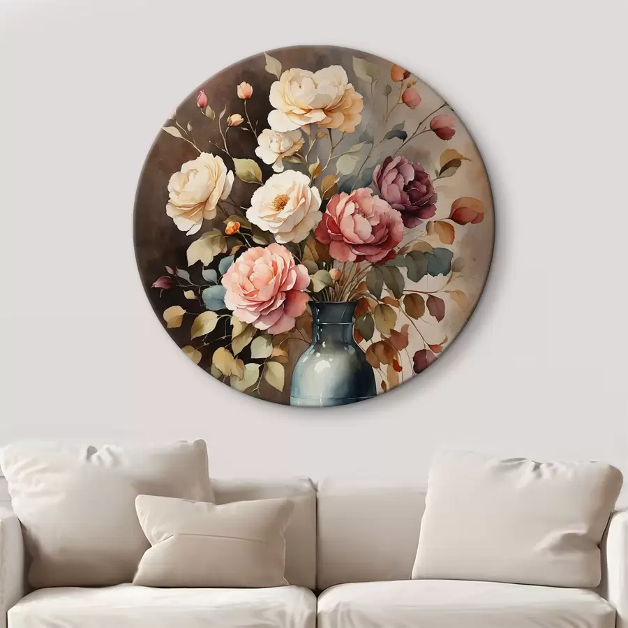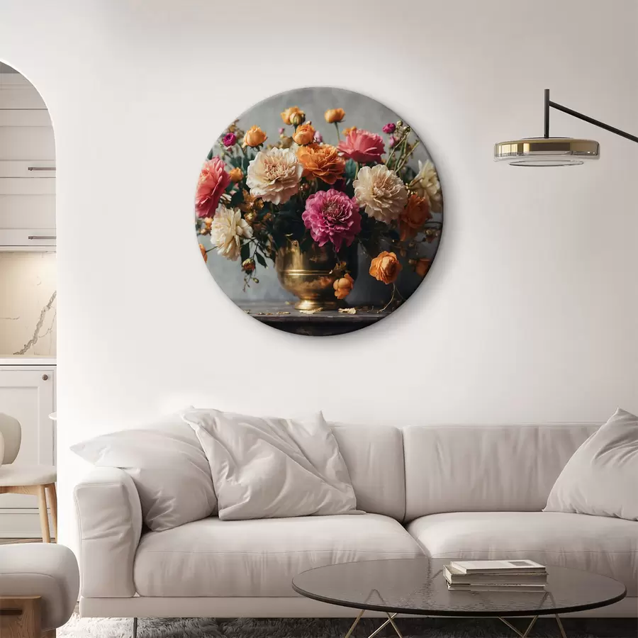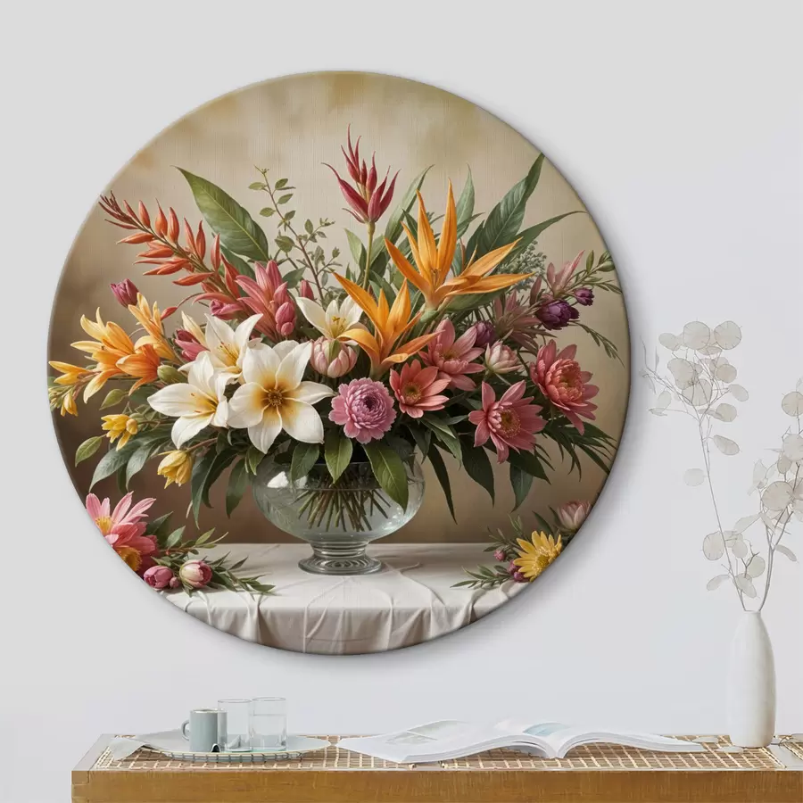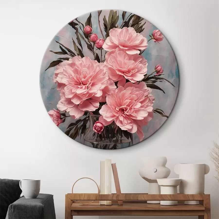 Švelnių gėlių puokštė stiklinėje vazoje, imituojanti paveikslą