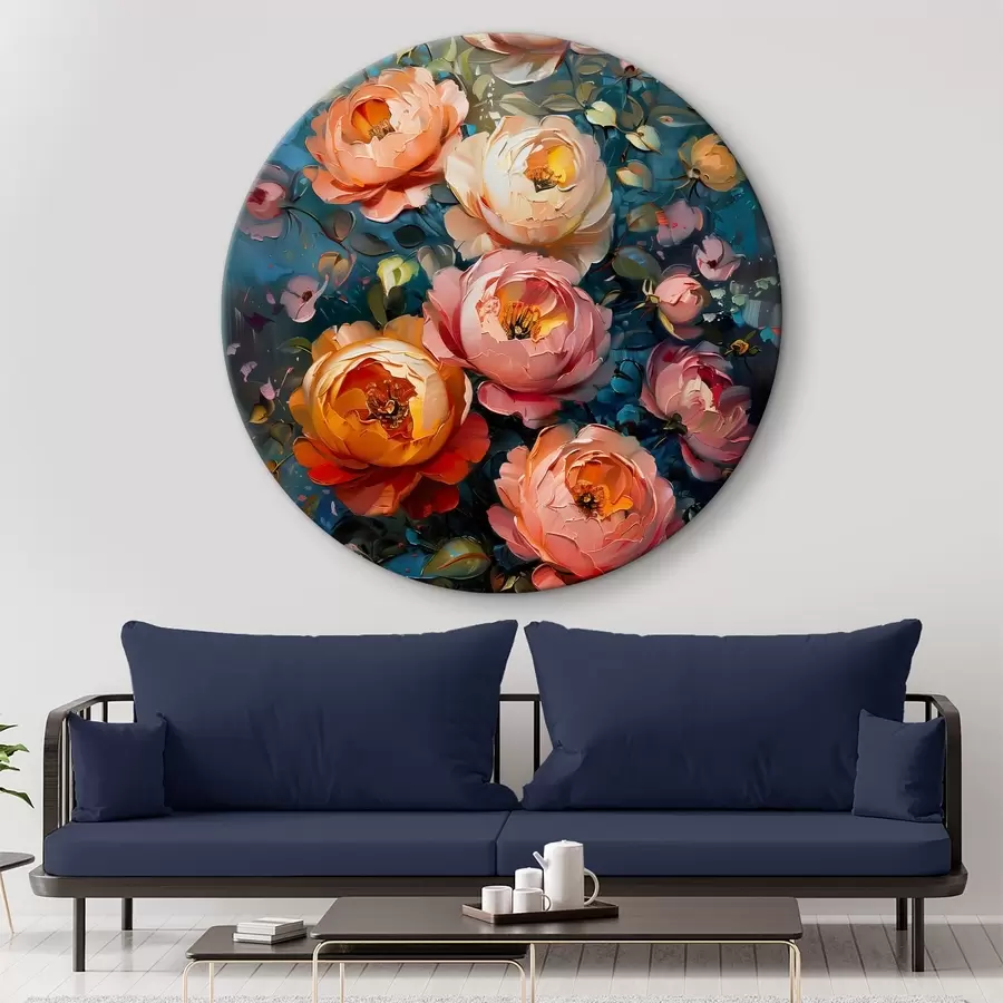 Abstrakti tapyba smėlio, geltonos, mėlynos, šalavijo žalios spalvos tonais su oranžiniais purslais, ryškiais bijūnais vasarą
