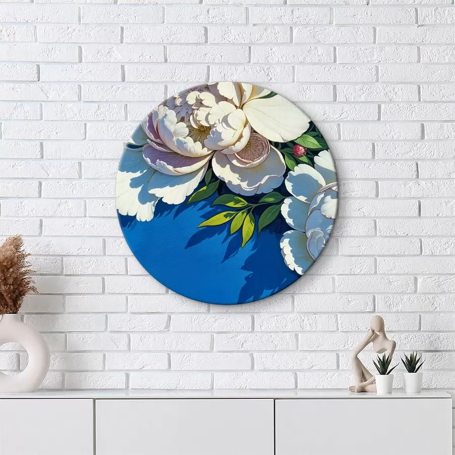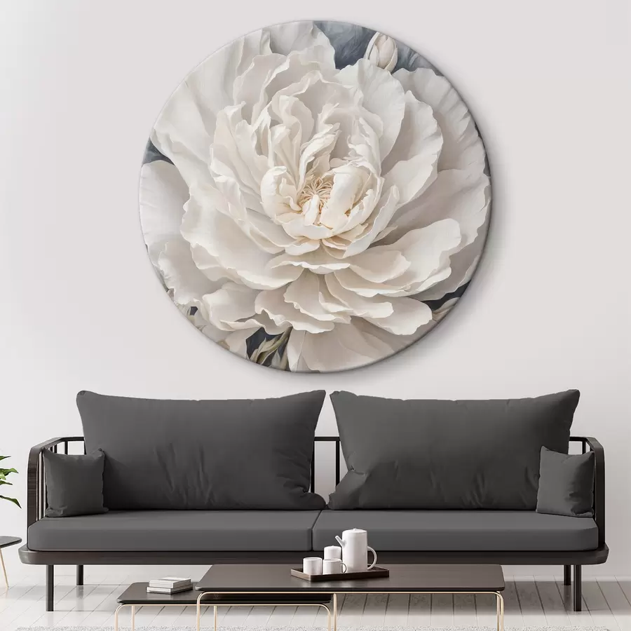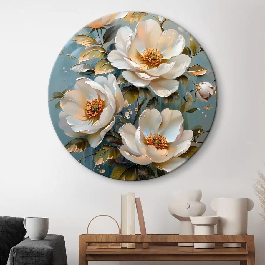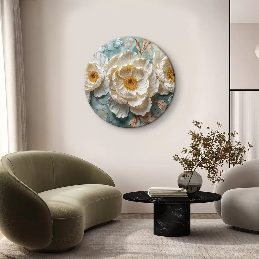 Didelis, subtilus impasto paveikslas iš baltų bijūnų gėlių su geltonais centrais, apsuptas melsvai žaliais lapais