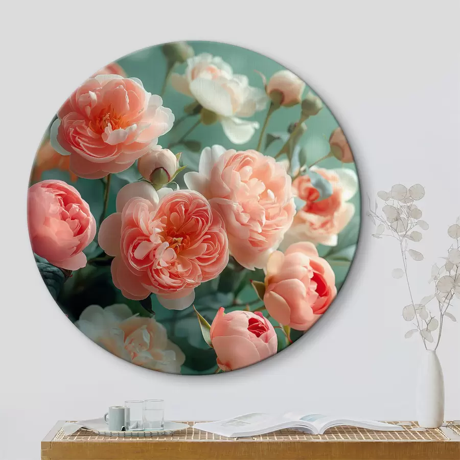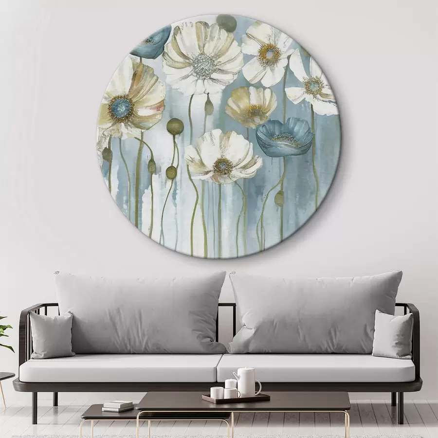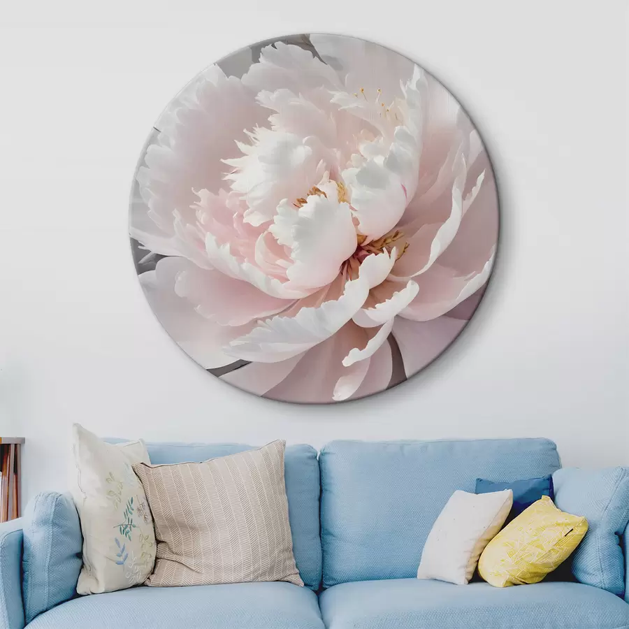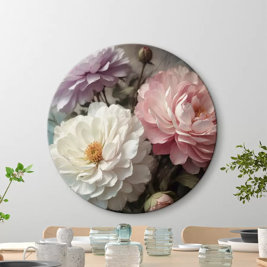 Didelis, subtilus impasto paveikslas iš baltų bijūnų gėlių su geltonais centrais, apsuptas melsvai žaliais lapais