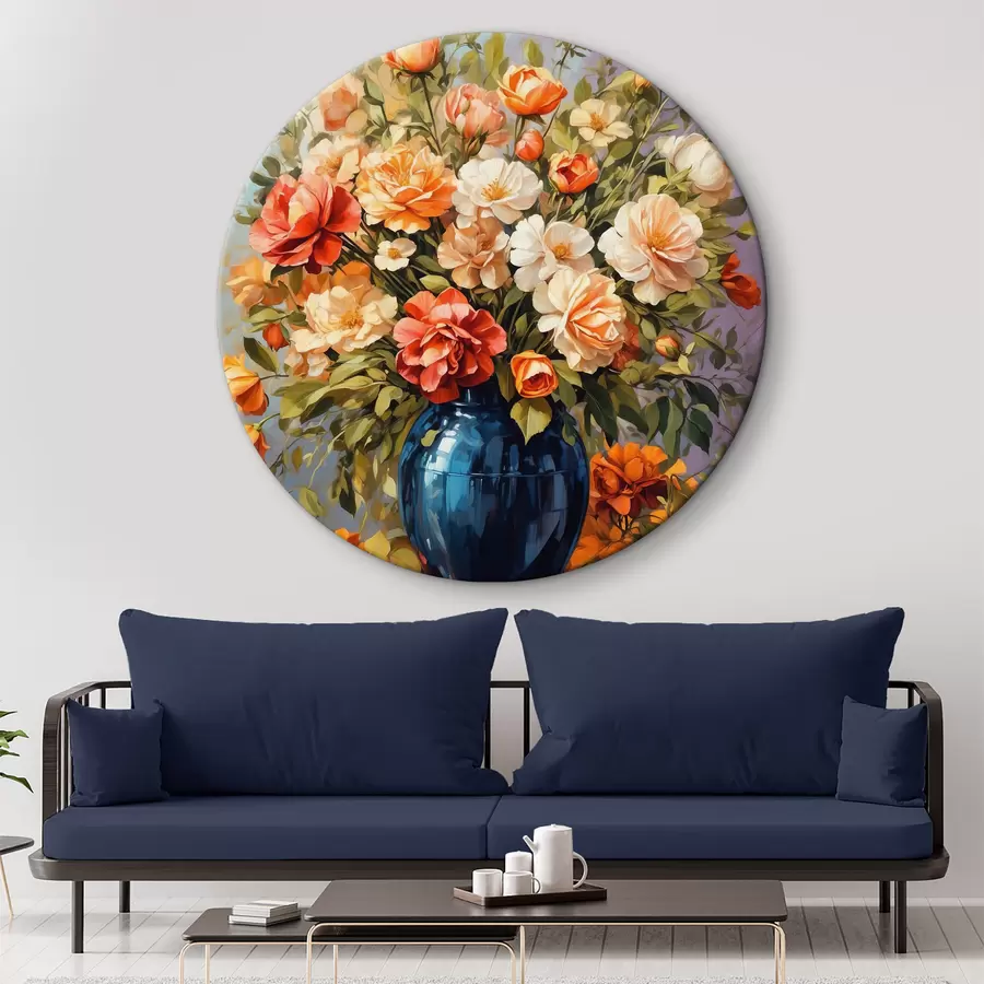 Oranžinių gėlių puokštė mėlynoje vazoje