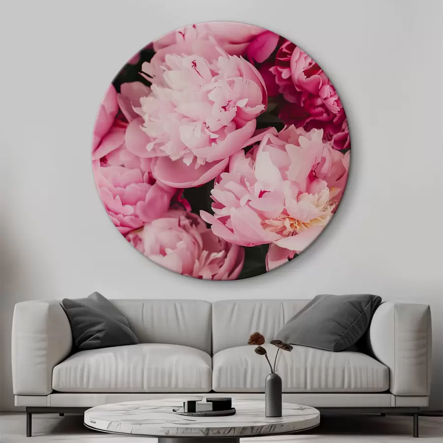 Didelių, švelnių rožinių bijūnų žiedų tamsiame fone stambiu planu