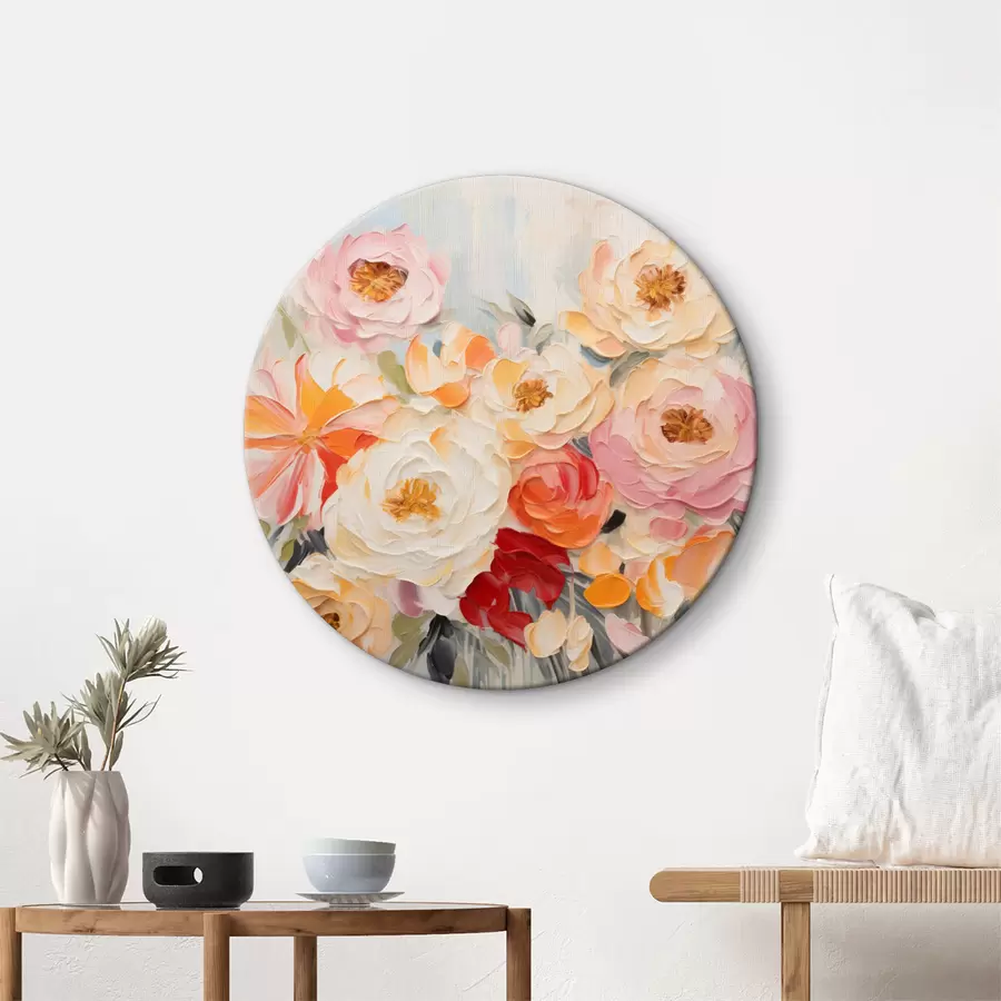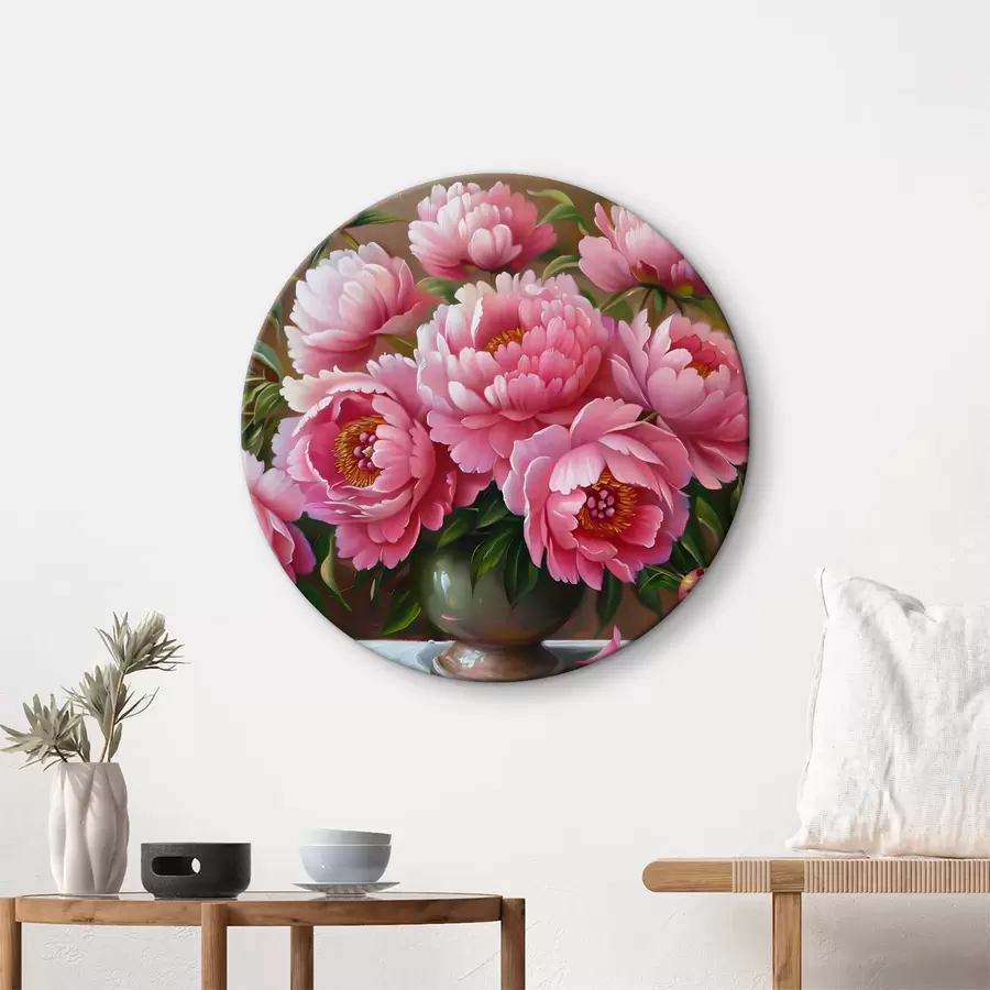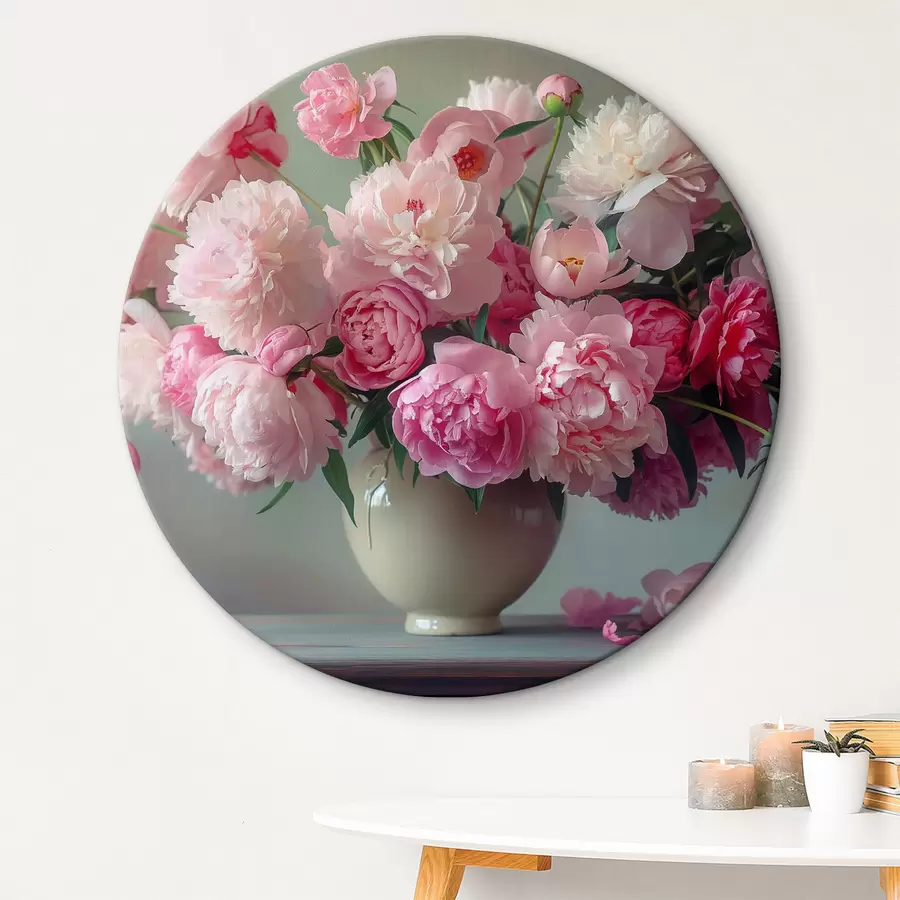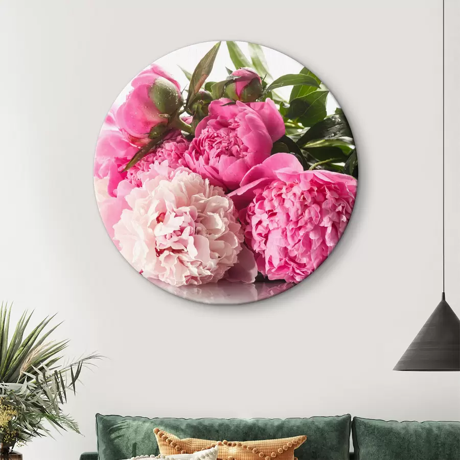 Įvairių rožinių, baltų ir geltonų atspalvių su dažų purslais ryškių bijūnų gėlių puokštė