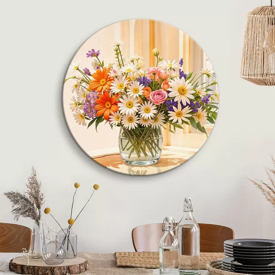 Spalvinga gėlių puokštė stiklinėje vazoje ant stalo priešais langą šiltame saulėtame fone