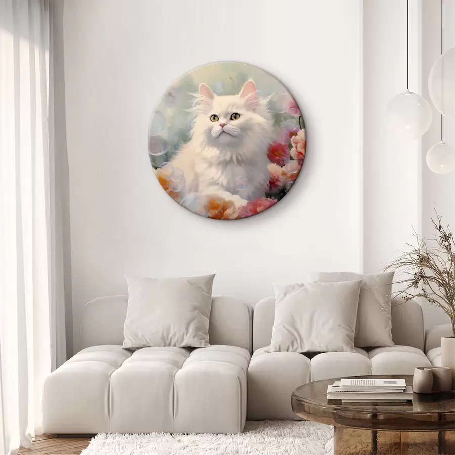 Balta pūkuota katė gėlių ir muilo burbulų sode akvarelė
