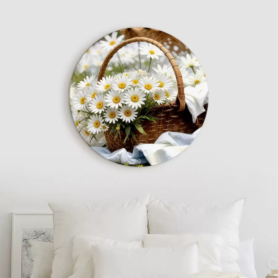 Pintas krepšelis, užpildytas baltomis ramunėlių gėlėmis, ant žolinio paviršiaus su balta antklode