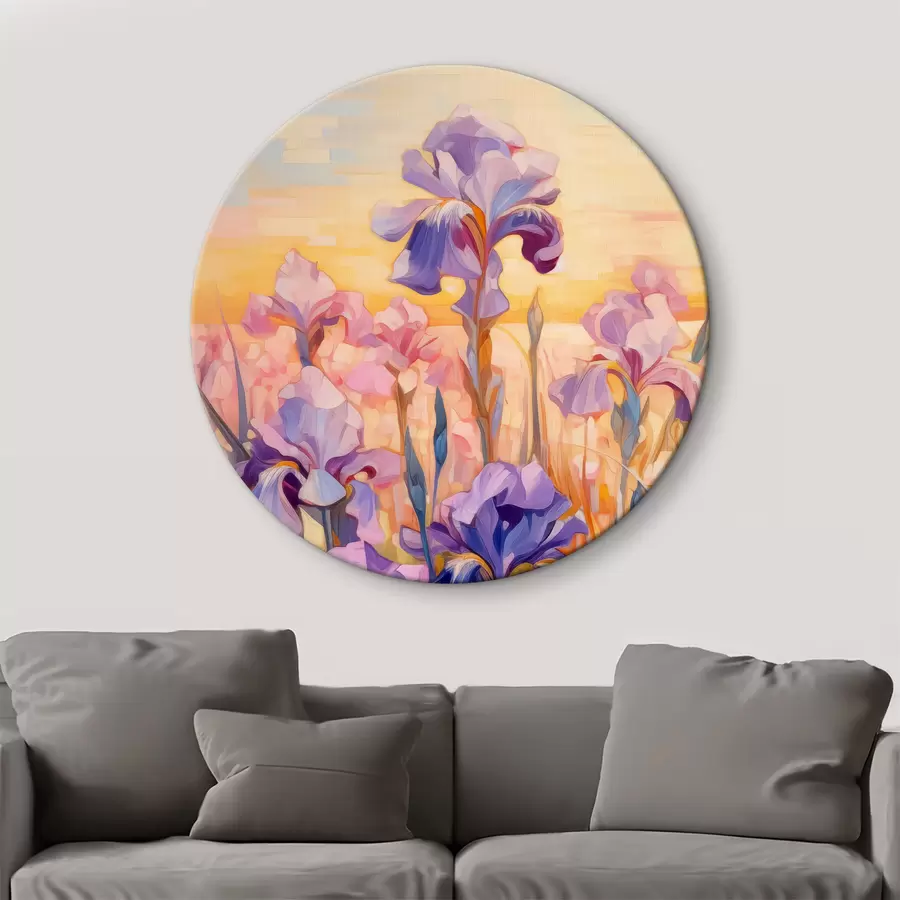 Žydintys vilkdalgiai lauke saulėlydžio metu aliejinė tapyba, mėlyna, oranžinė, violetinė, rožinė, geltona spalva