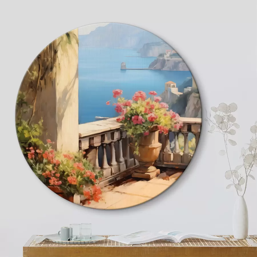 Tapyba aliejiniais dažais balkono su gėlėmis imitacija, su vaizdu į jūrą, namus pakrantėje, saulėtą dieną, mėlynas dangus