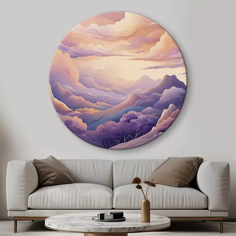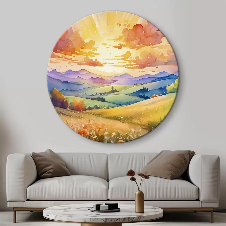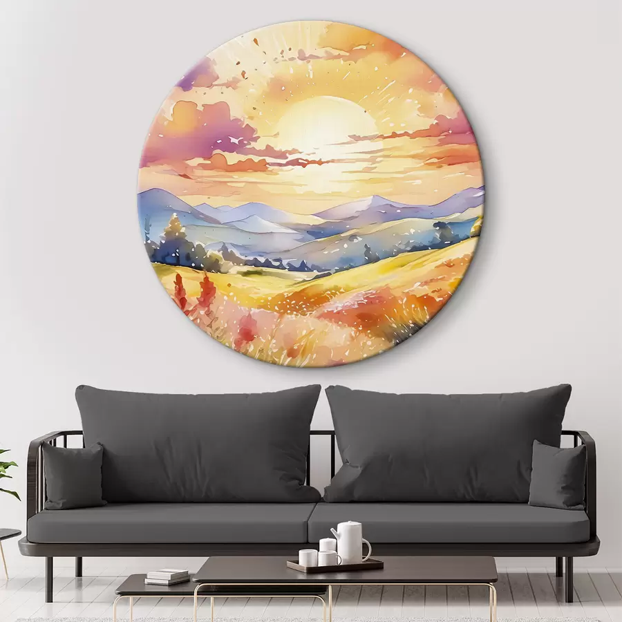 Akvarelė Kalnų kraštovaizdis, saulėtekis, minkštos violetinės, rožinės ir mėlynos spalvos