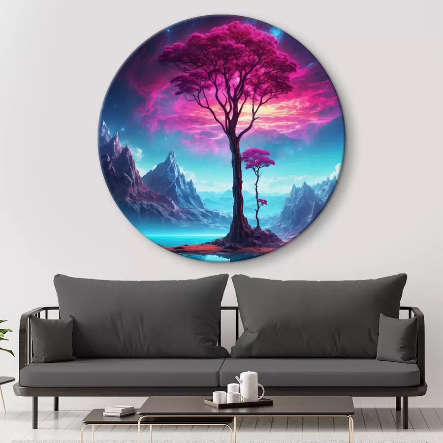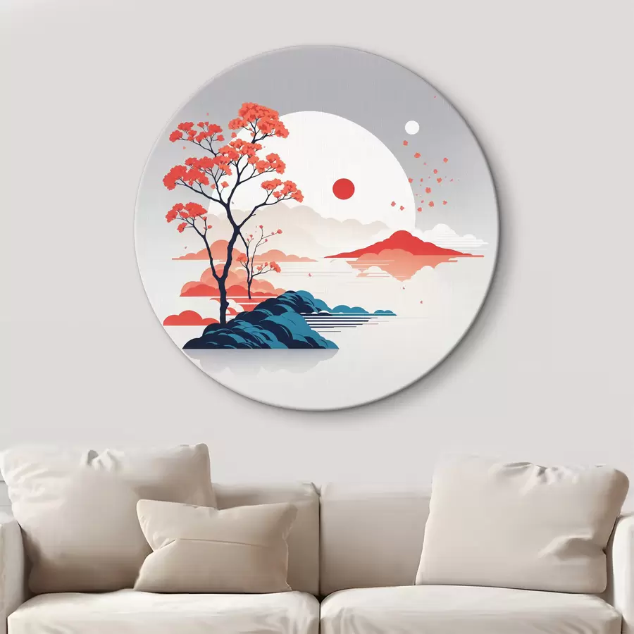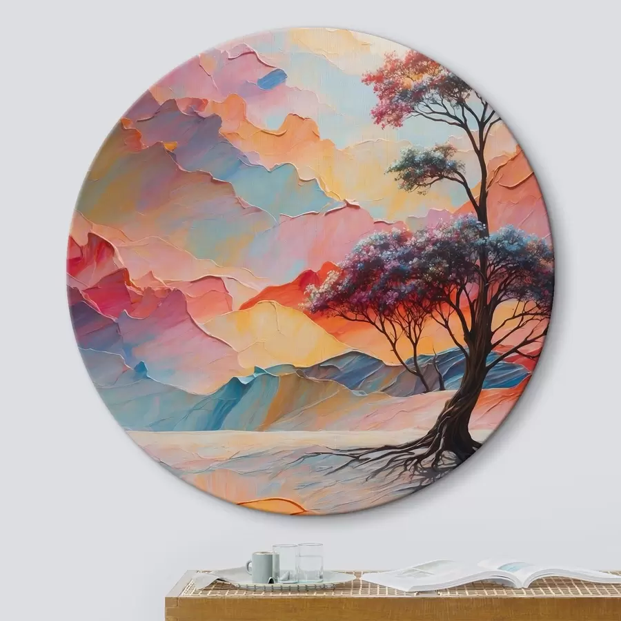 Medis ir saulė abstrakčiame fone akrilo stiliumi