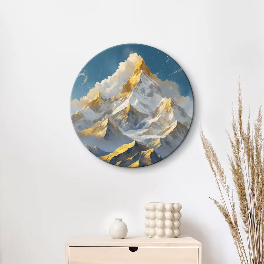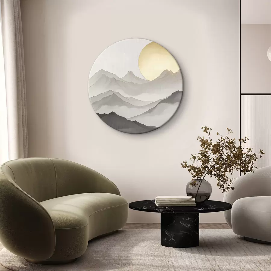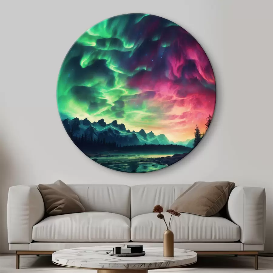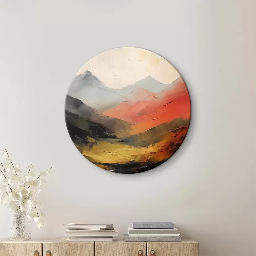 Įvairiaspalviai kalnai mėnulio fone akrilo tapybos stiliumi