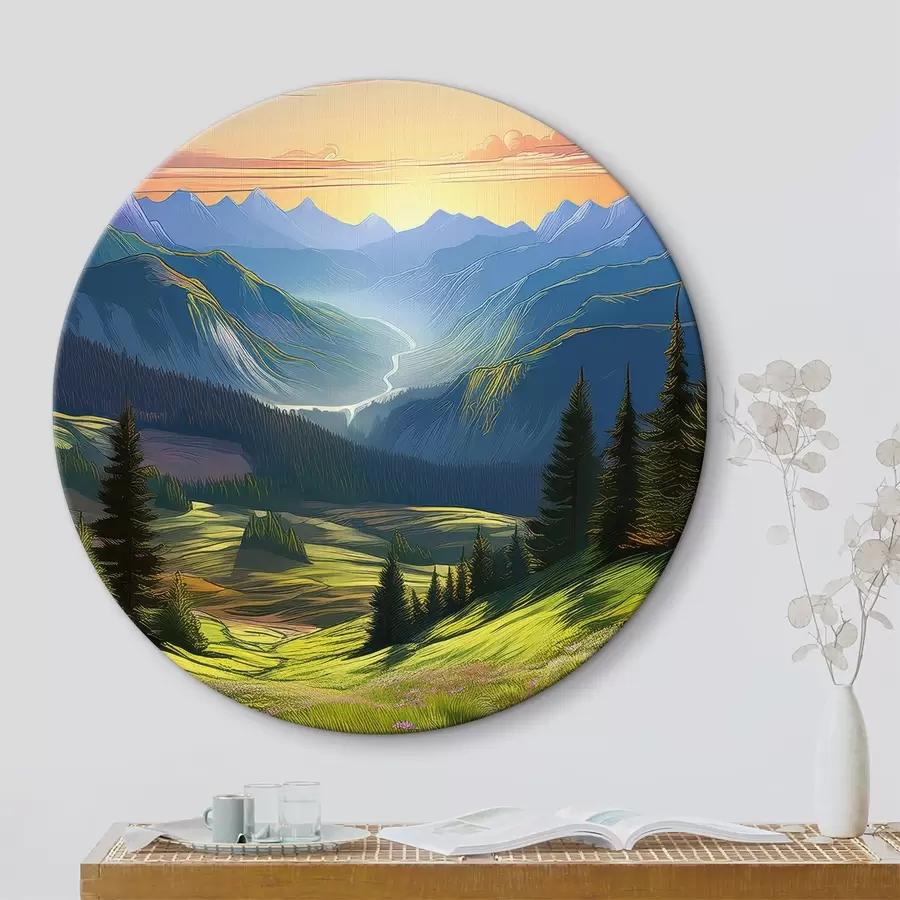 Vasaros pieva, spalvingas dangus su debesimis, medžiais ir gėlėmis, kalnų peizažas