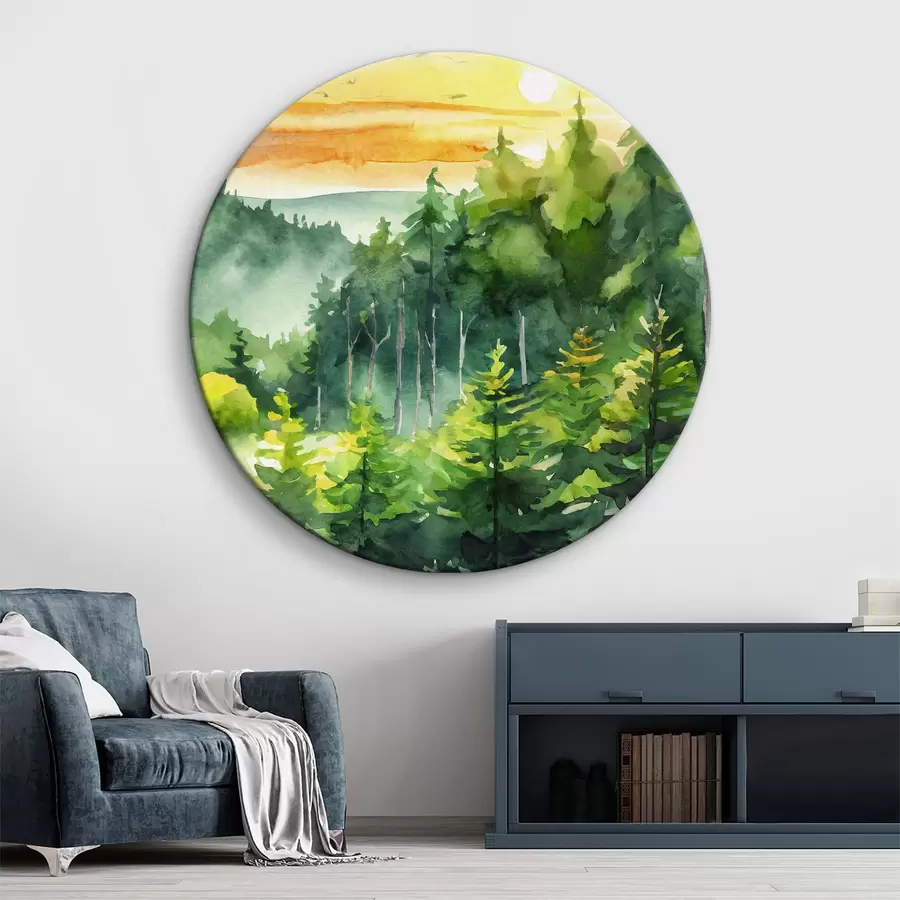 Miško kraštovaizdis, saulėlydžio dangus, akvarelė, žaluma, pušys, gamta
