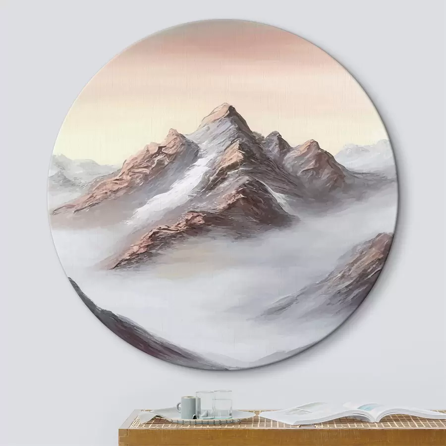 Šviesūs kalnai, debesuotas dangus, teptuko potėpių imitacija, raudona, geltona, mėlyna, juoda spalva