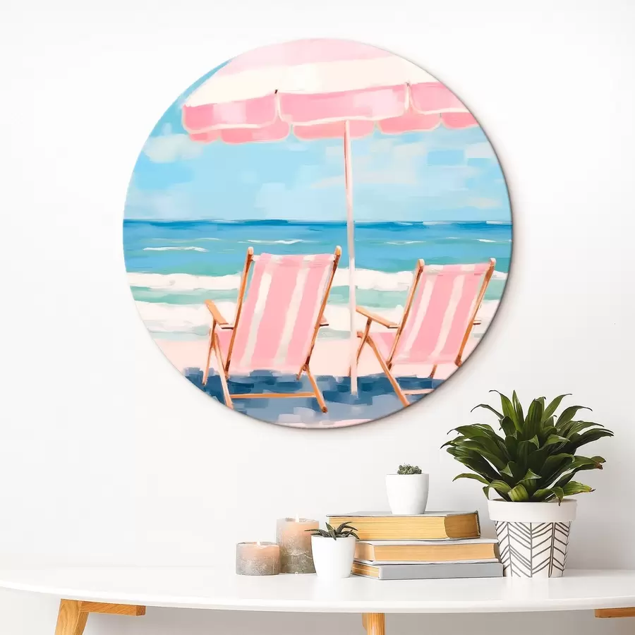Spalvinga aliejinė tapyba, vaizduojanti pajūrio miestelį su baltais namais ir gyvybingu gėlių sodu pirmame plane