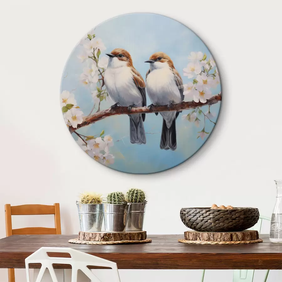 Ant žydinčios šakos sėdintys žvirbliai aliejinė tapyba, mėlyna, balta, ruda