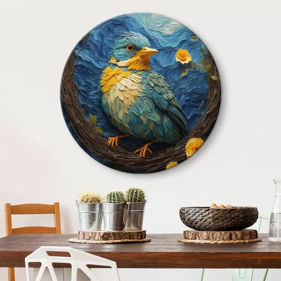 Mėlynas paukštis ant šakos su akvarelės stiliaus lapais