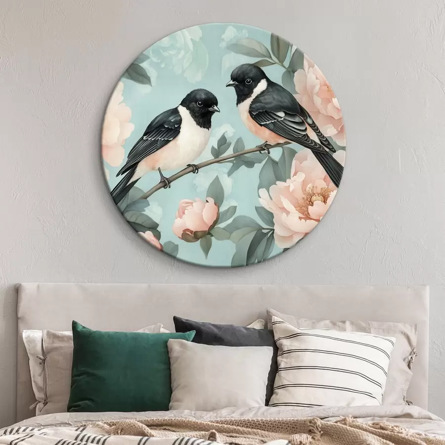 Spalvingi paukščiai ant šakos švelniame pastelinių spalvų fone