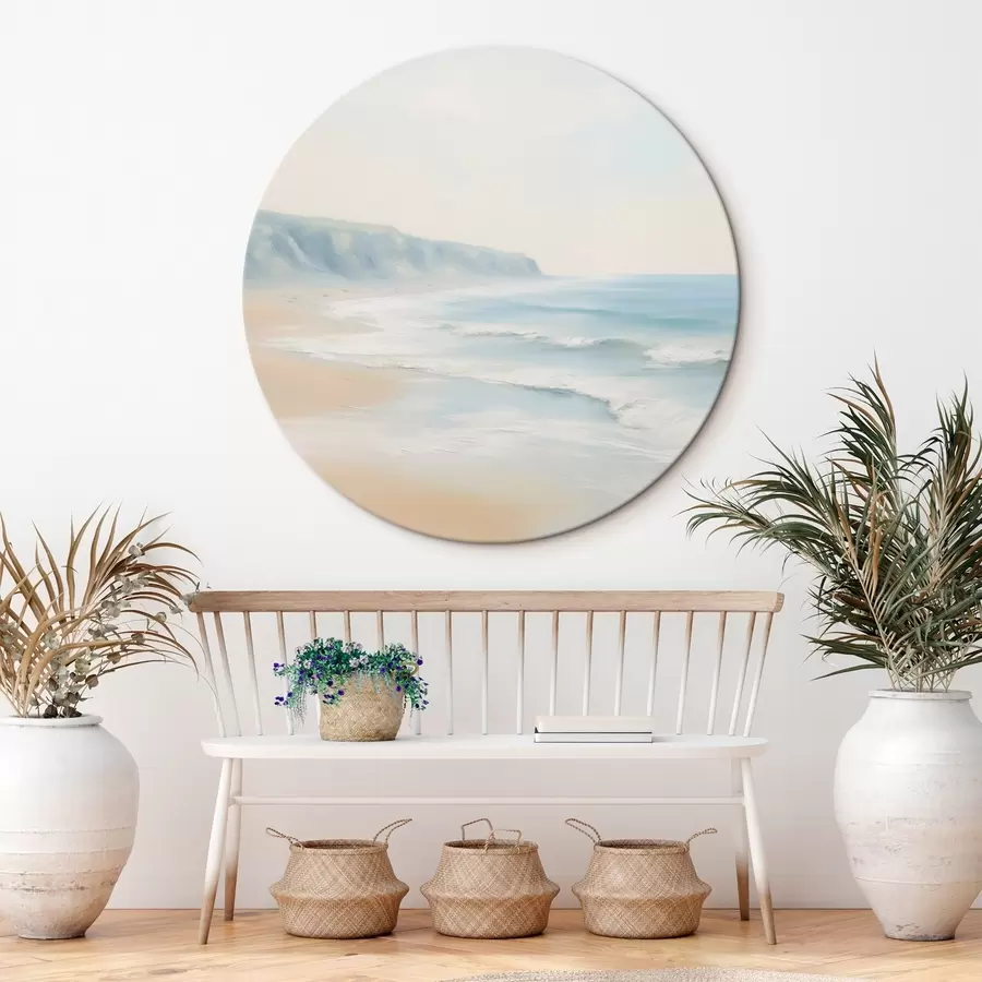 Ramioje jūroje plaukiojančios burinės valtys su rausvomis burėmis, valčių atspindžiai vandenyje, švelnios pastelinės spalvos