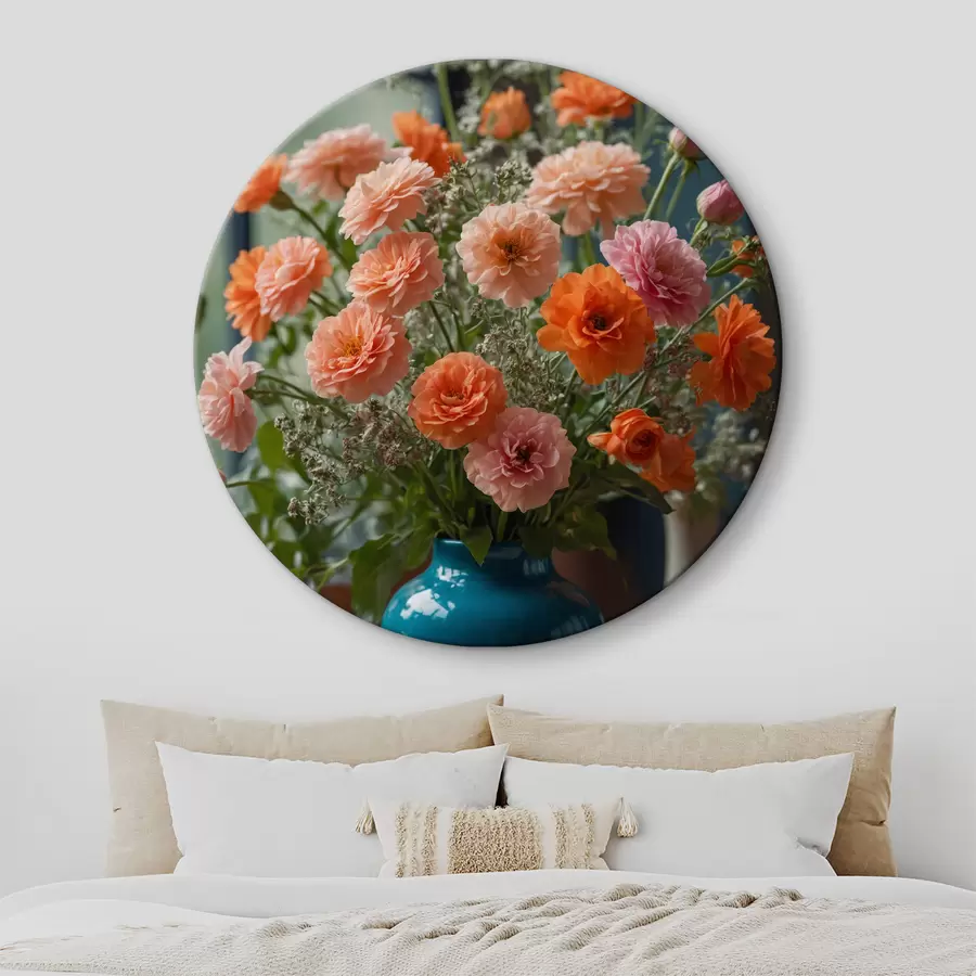 Oranžinių gėlių puokštė mėlynoje vazoje