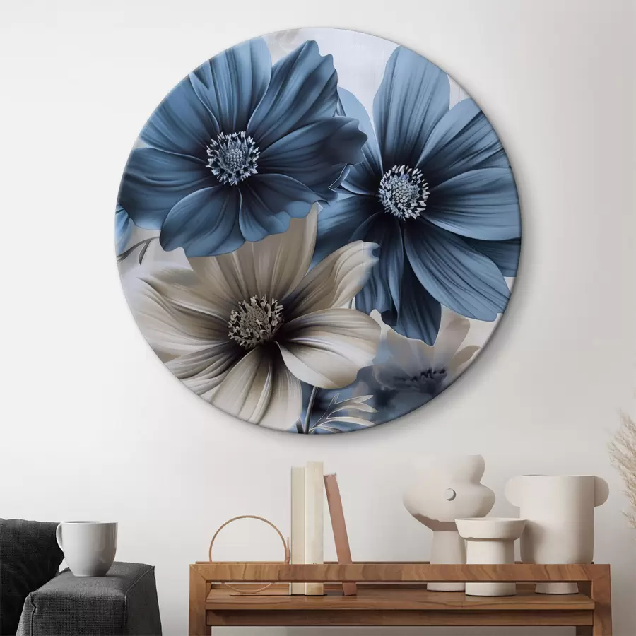 Gėlės mėlynoje vazoje prie tamsiai mėlynos sienos