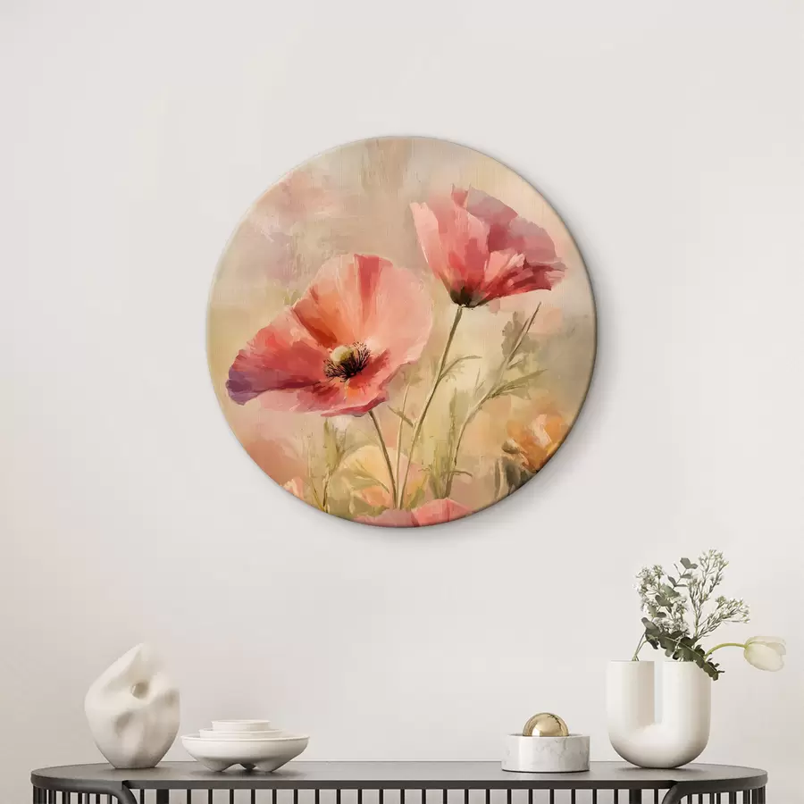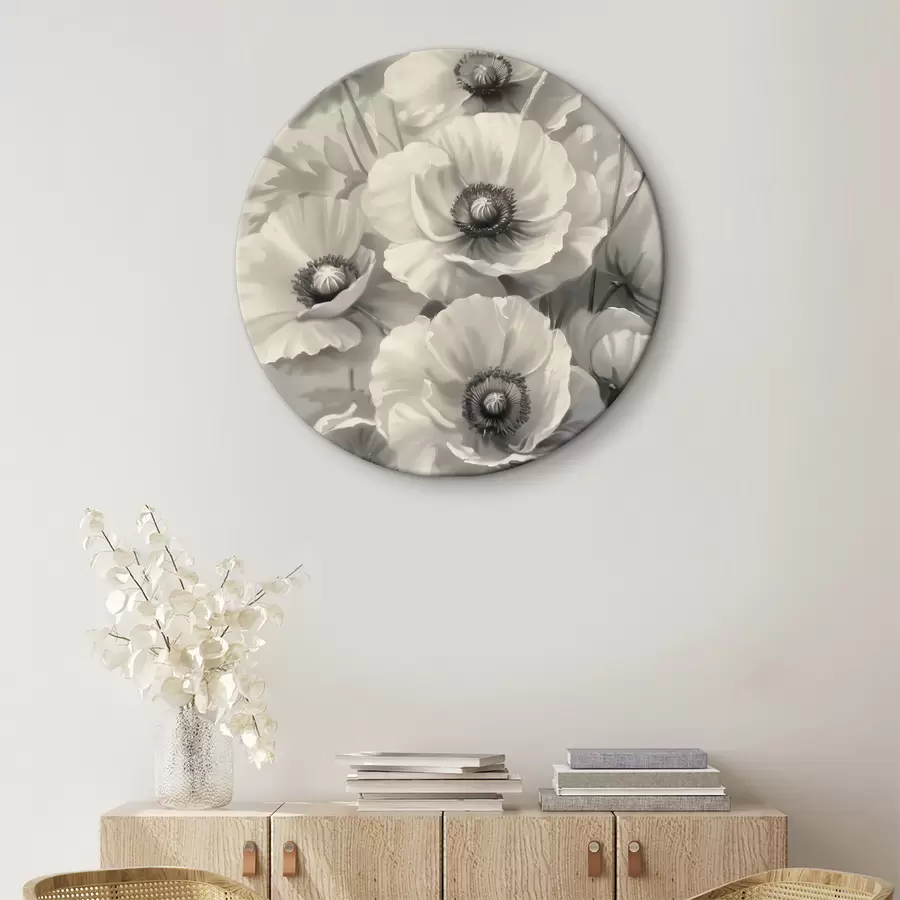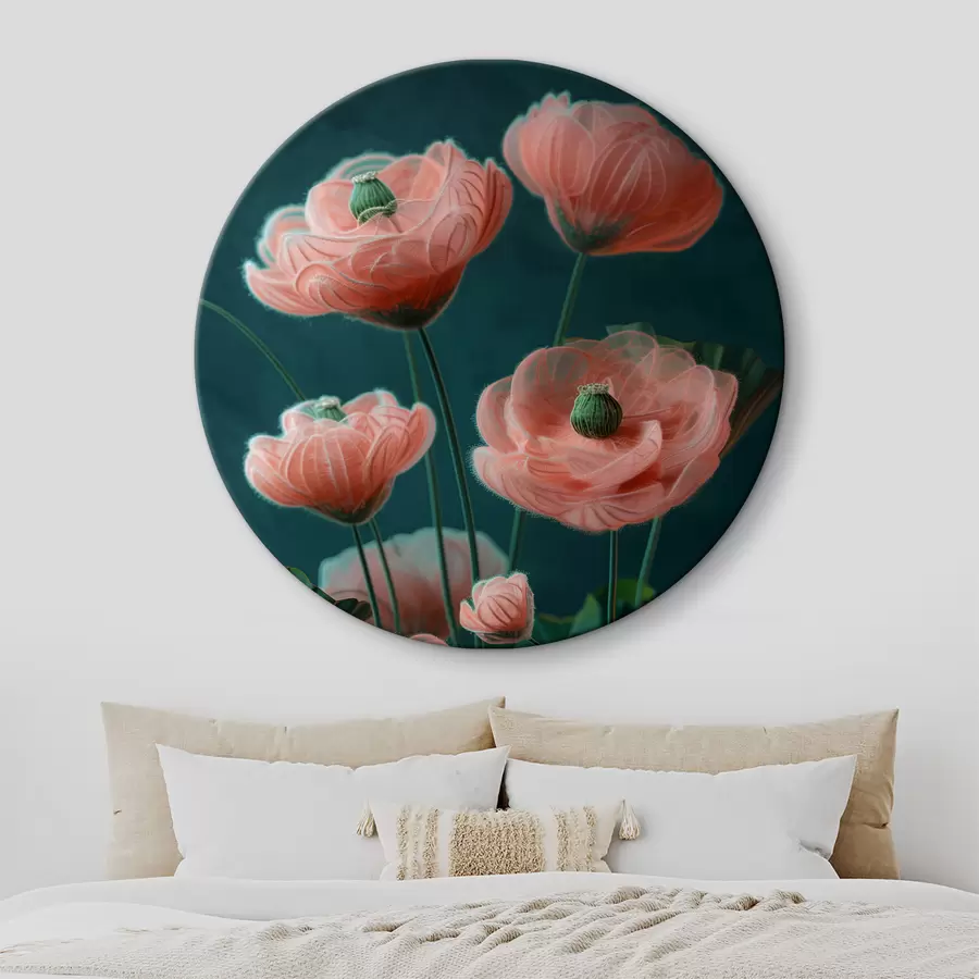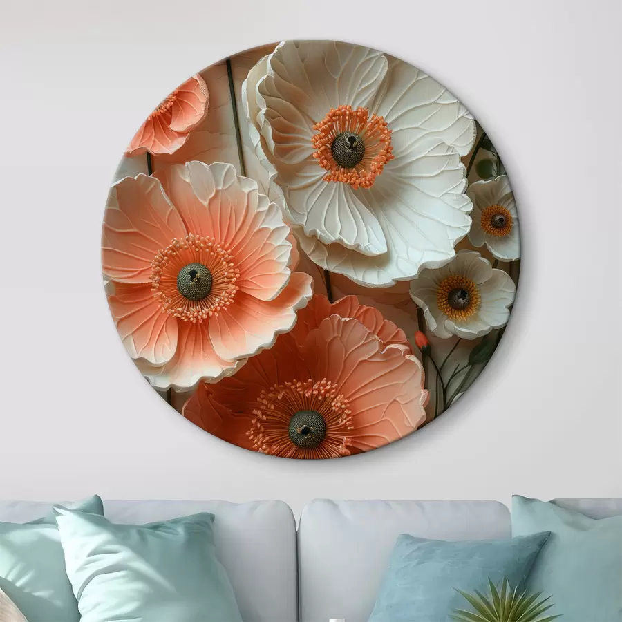 Neutralios spalvos minkštos skulptūros stiliaus aguonos su šviesiai rožiniais ir šviesiai oranžiniais žiedpumpuriais