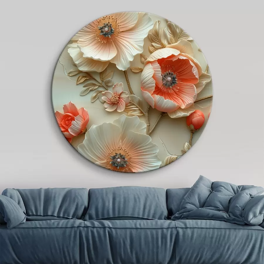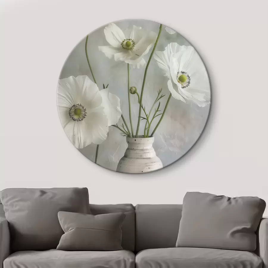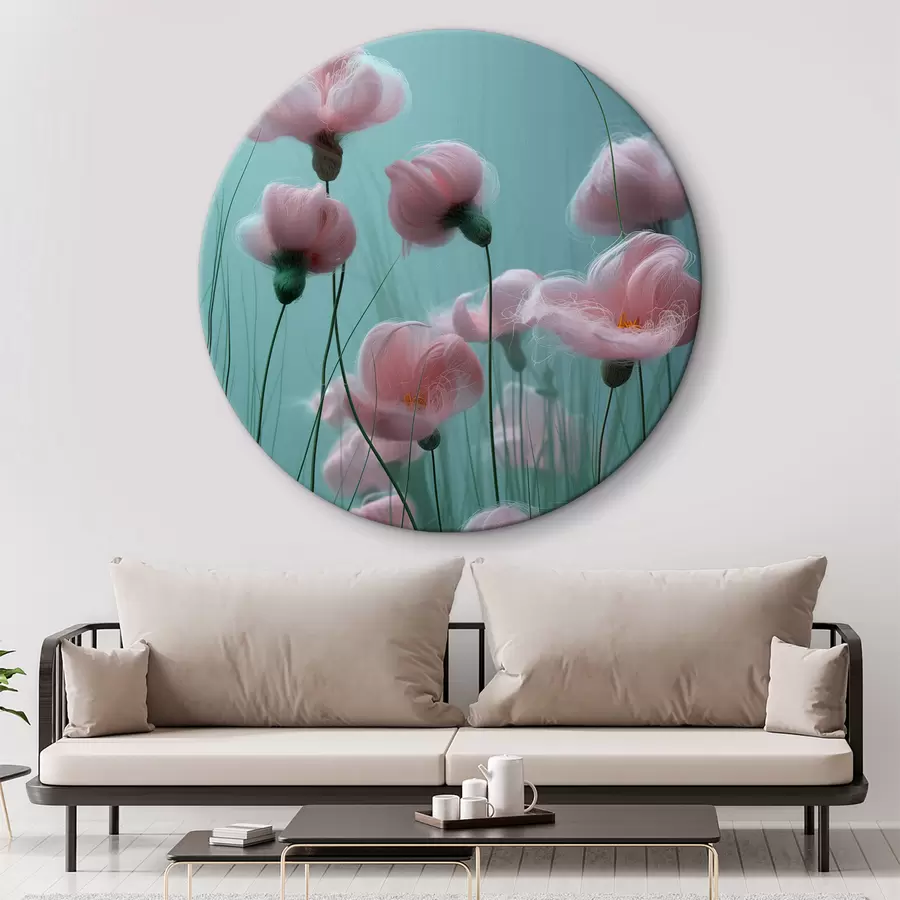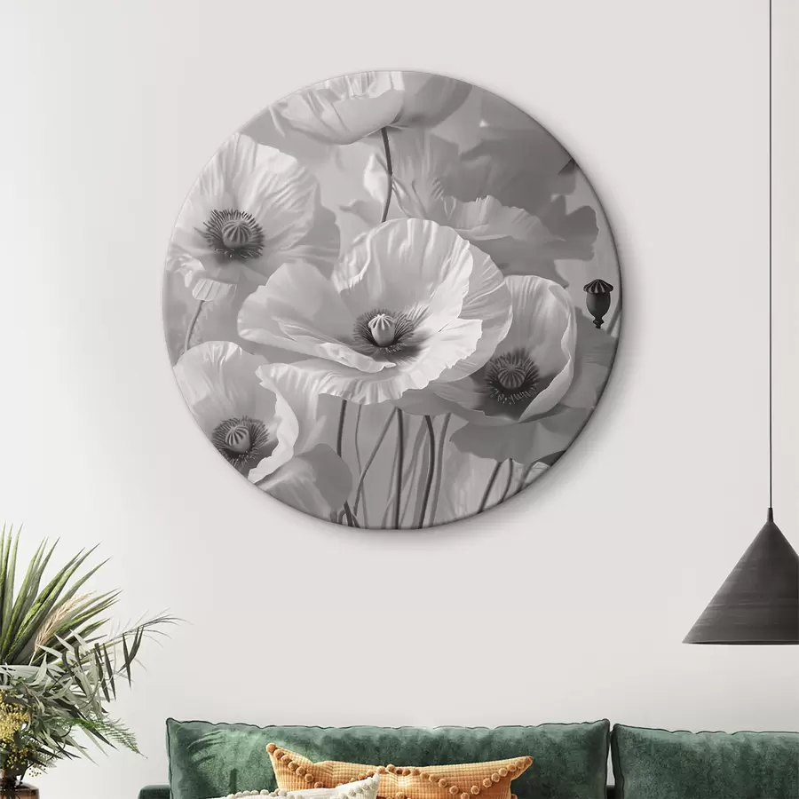 Neutralios spalvos minkštos skulptūros stiliaus aguonos su šviesiai rožiniais ir šviesiai oranžiniais žiedpumpuriais
