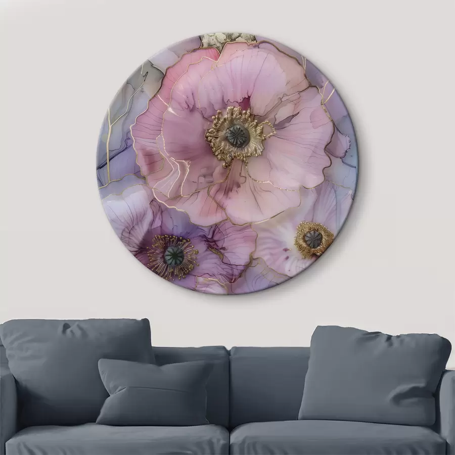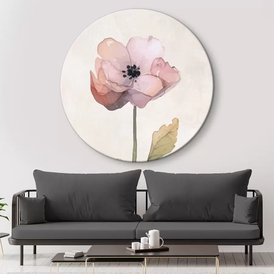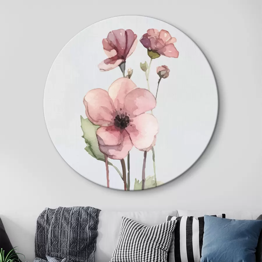 Švelni rausvų ir alyvinių aguonų puokštė šviesiame fone, akvarelės stilius