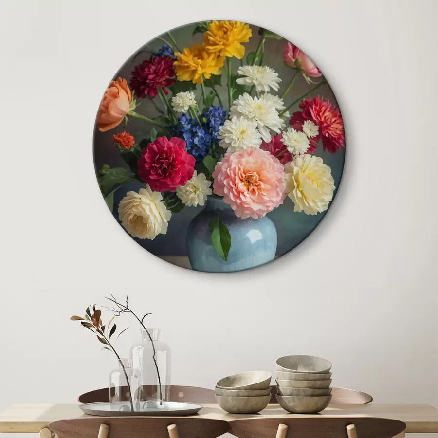 Ryškus paveikslas su spalvingų gėlių puokšte, įskaitant raudonas rožes, geltonus narcizus ir baltas ramunes