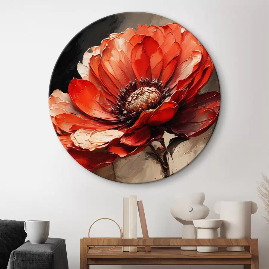 Abstrakti aliejinės tapybos imitacija - raudonų ir baltų aguonų ir margučių gėlių laukas pilkame tekstūriniame fone