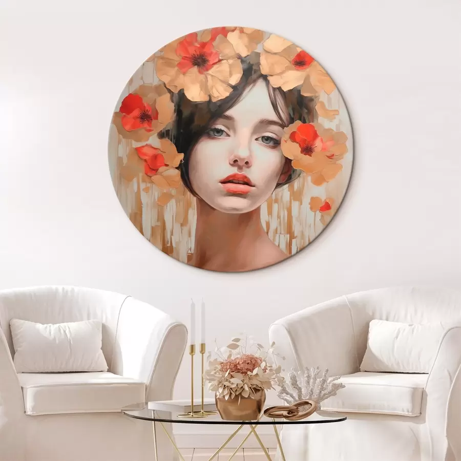 Moters portretas su gėlėmis plaukuose ir raudonomis lūpomis