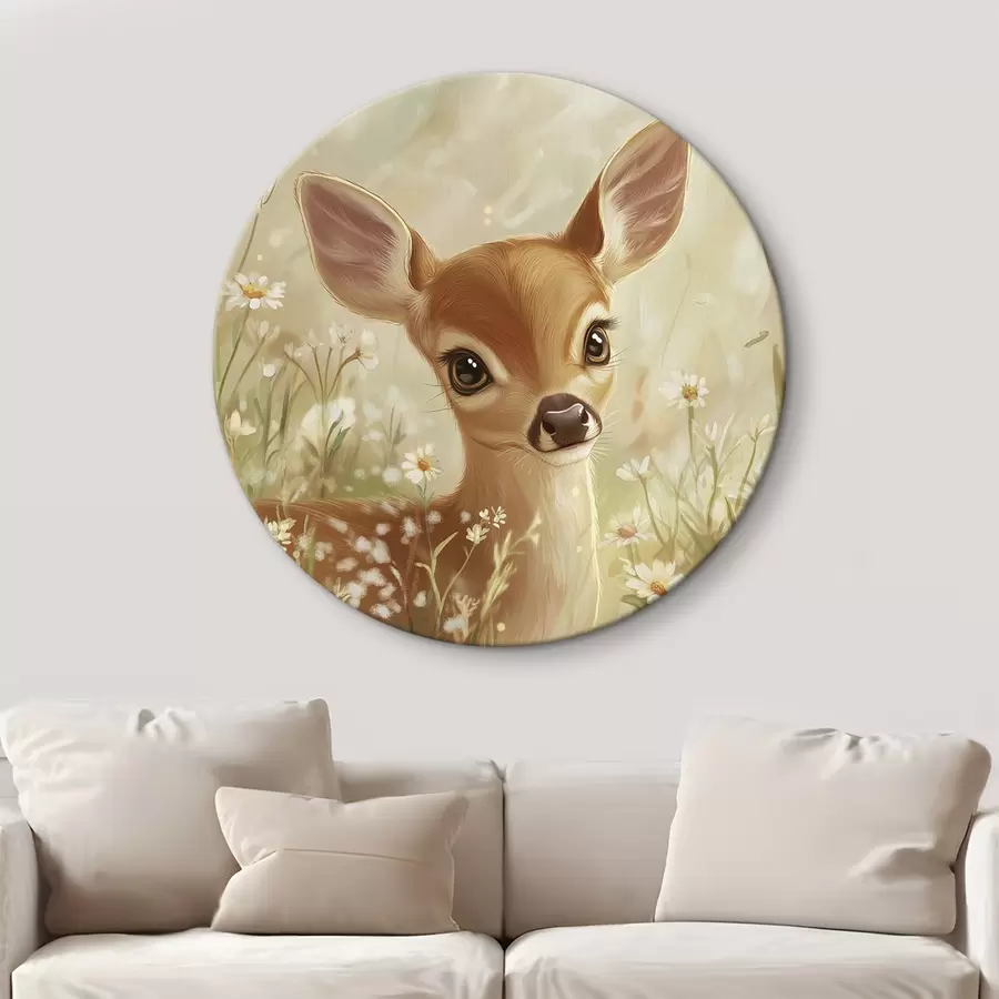Mažas elniukas vasaros pievoje, akrilo stiliaus piešinys, pastelinės rožinės ir smėlio spalvos