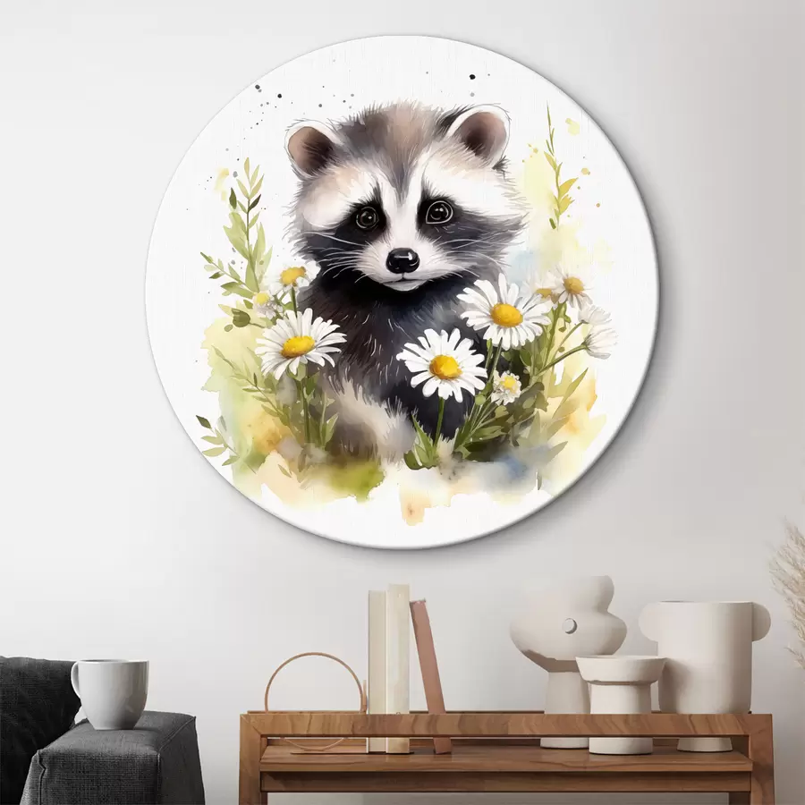 Mažasis meškėnas, sėdintis ramunėlių akvarelinėje vaikiškoje iliustracijoje