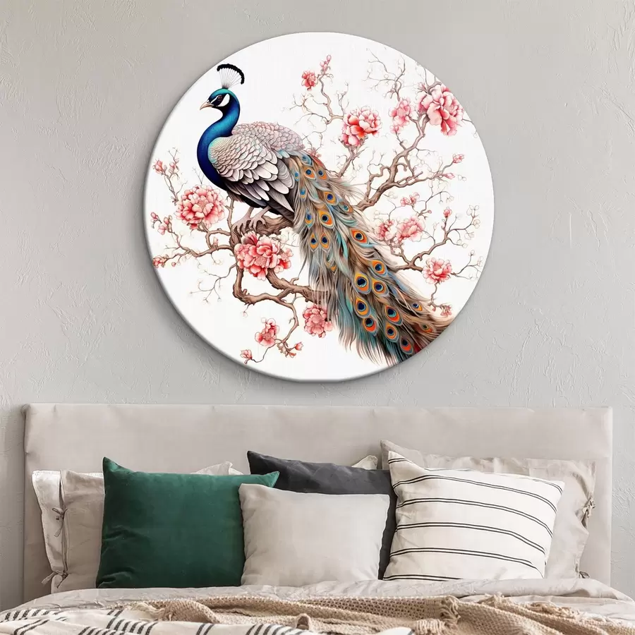 Paukštis sėdi ant šakos su žydinčiomis gėlėmis, mėlynos, rožinės, raudonos, oranžinės, geltonos spalvos