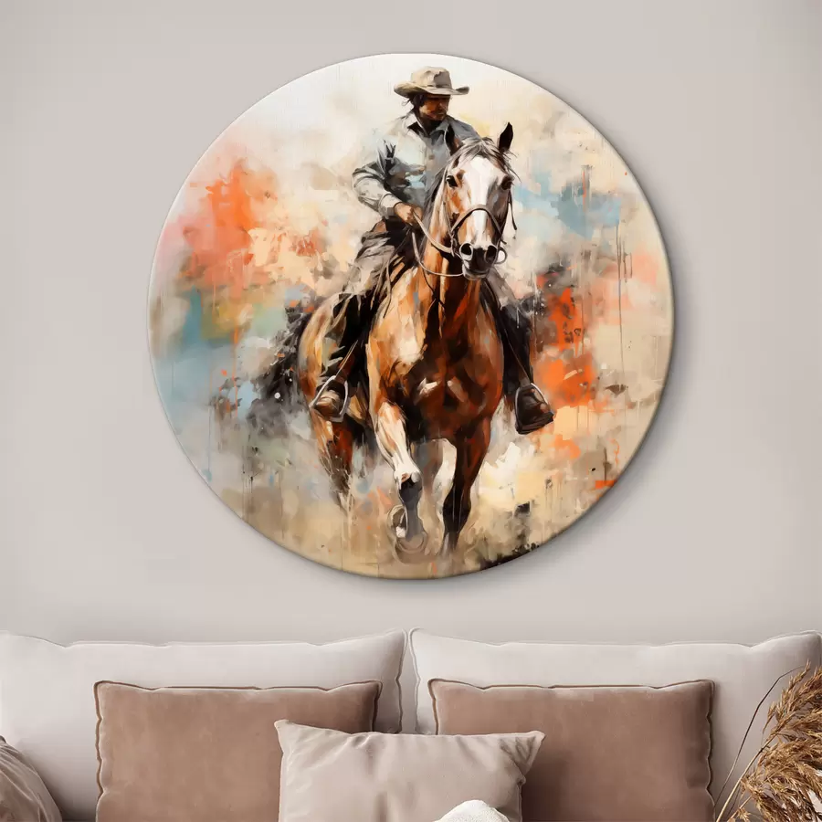 Raitelis kaubojus su skrybėle šokinėja ant rudo arklio aliejumi tapyto abstraktaus meno paveikslo