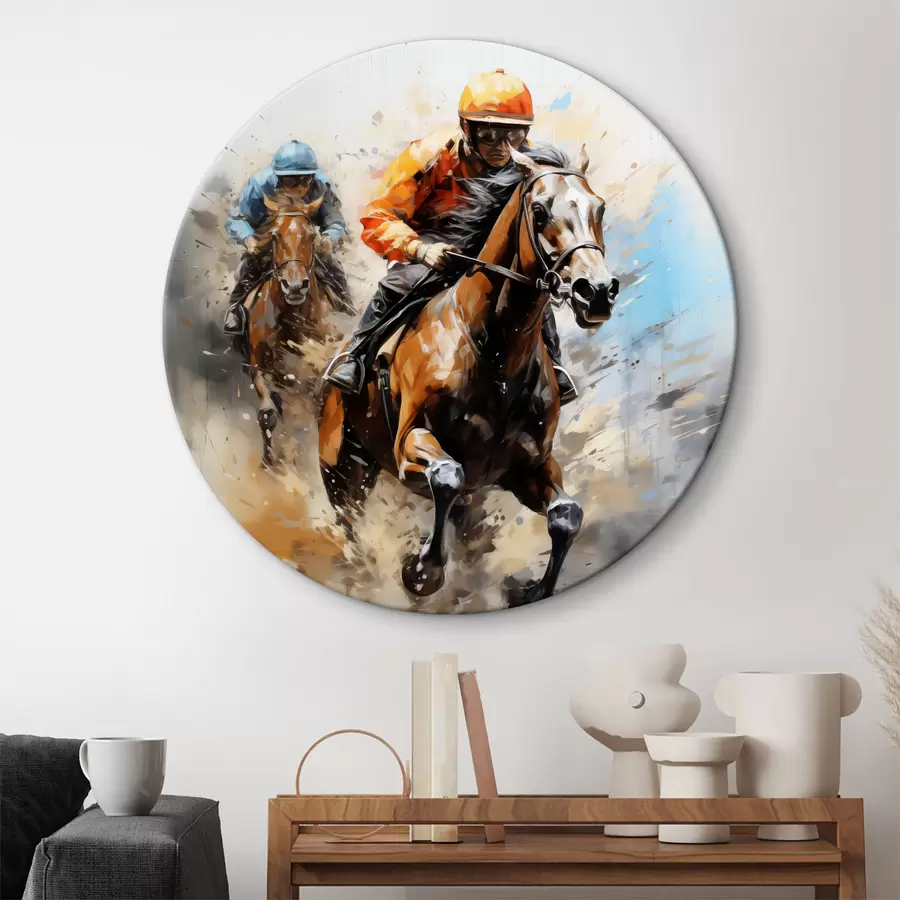 Raiteliai, šuoliuojantys ant žirgų hipodrome, žmonės, aliejinė tapyba, mėlyna, oranžinė, ruda spalva