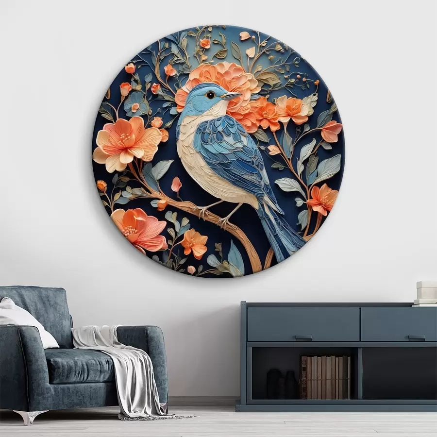 Mėlynas paukštis ant šakos su akvarelės stiliaus lapais